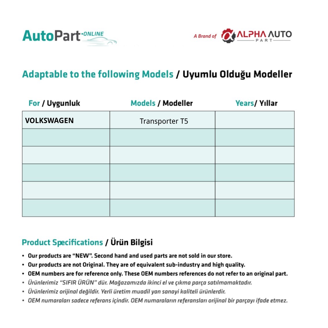 Volkswagen Transporter T5 için Dış Orta Kapı Açma Teli